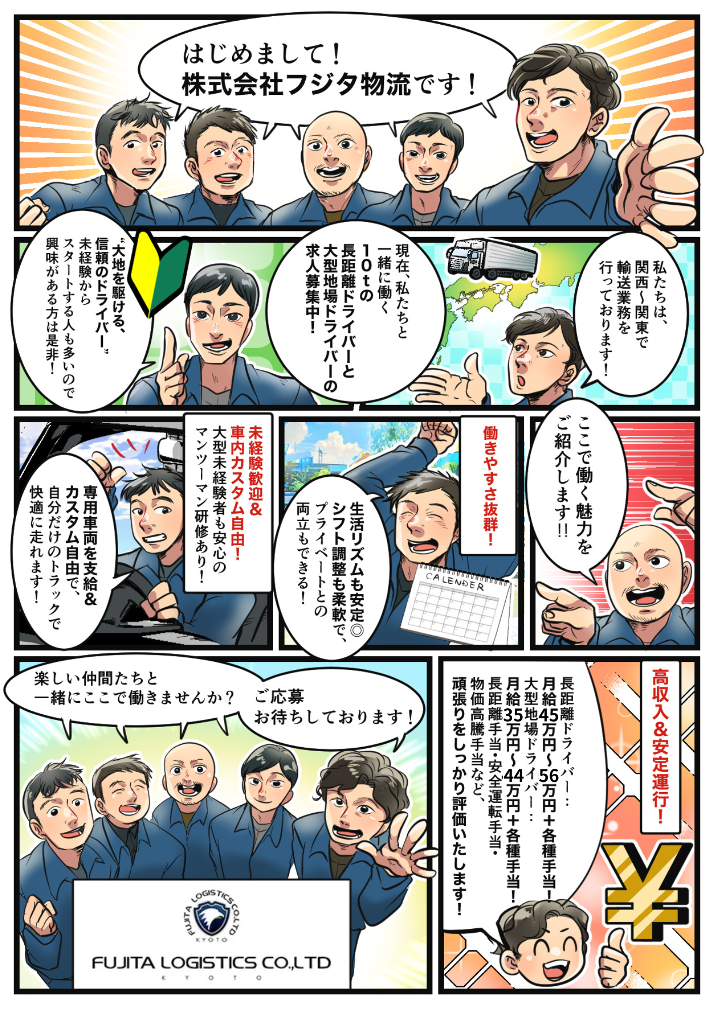 当社は京都府を拠点に、関西と関東エリアを中心とした長距離・地場輸送を行っている物流会社です。現在、業務拡大に伴い新たにドライバーを募集しています。 未経験からスタートできる丁寧な研修制度や、1人1台の専用車両など、安心して働ける環境を整えています。今後さらに成長を続ける当社で、物流を支えるやりがいを実感しながら、一緒にキャリアを築いていきませんか? 経験・学歴は問いません。新しい挑戦を応援する当社で、ぜひあなたの力を発揮してください!